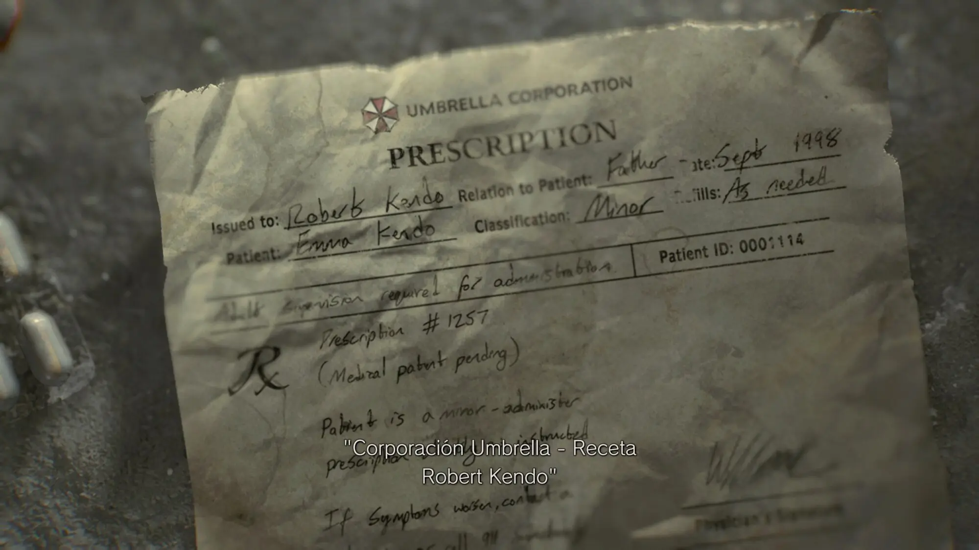 | Receta — Robert Kendo | Armería Kendo, centro de Raccoon City | Prescripción de Umbrella Corporation para Emma Kendo (menor), emitida a Robert Kendo (padre) en septiembre de 1998. Medicación con patente pendiente. Supervisión adulta requerida. |