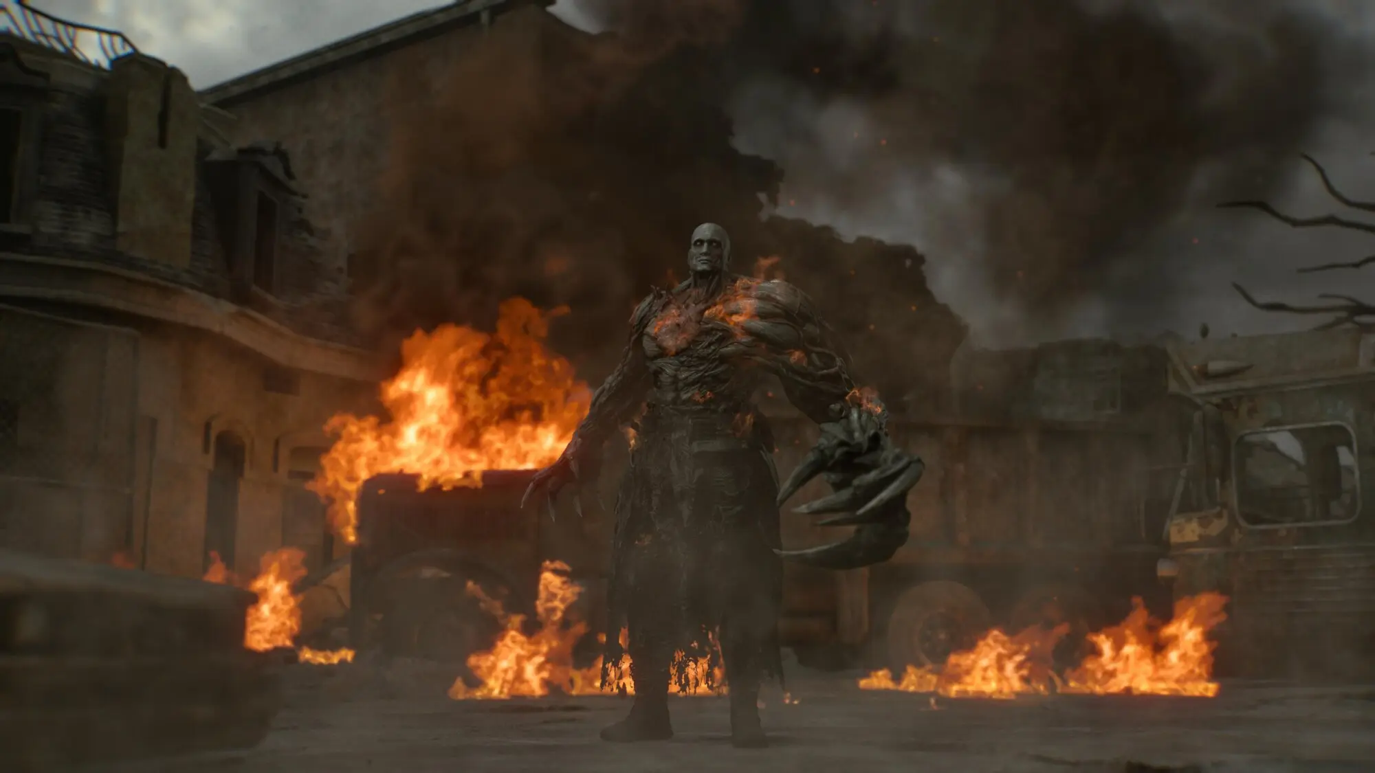 Un primer plano extremo de Leon confirma la gravedad de la situación. Los ojos entrecerrados, la mandíbula apretada, una media sonrisa amarga que dice "otra vez no". Leon ha sobrevivido a Tyrants antes — en Raccoon City en el 98, pero nunca deja de ser una pesadilla.
