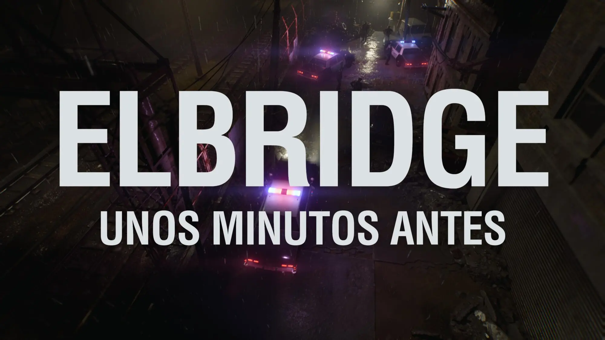 El juego te hace un cambio de perspectiva brutal. Acabas de dejar el Hotel Wrenwood con Grace y de repente la pantalla muestra una sola palabra en letras enormes: ELBRIDGE. Y debajo: "Unos minutos antes." Así de seco. Así de efectivo. Ahora eres Leon S. Kennedy y estás en las calles mojadas de otra ciudad mientras la lluvia lo empapa todo.
