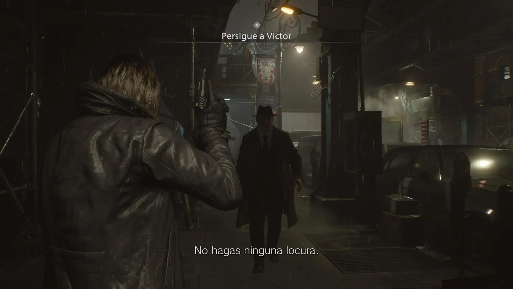 El objetivo del capítulo se activa enseguida en pantalla: "Persigue a Víctor." Y Víctor resulta ser el hombre de sombrero que aparece al fondo del callejón bajo la lluvia, tranquilo, como si esperara a Leon. Cuando le apuntas con la pistola, él levanta las manos y suelta una sola frase: "No hagas ninguna locura."