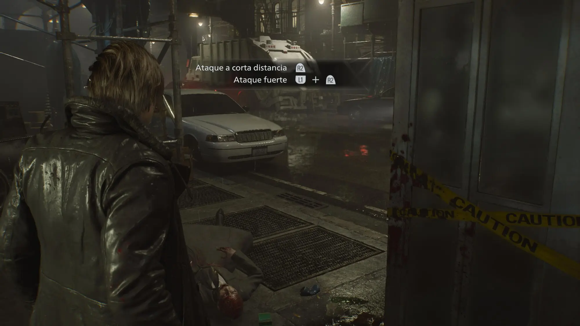 Este es el primer momento en que controlas a Leon y el contraste con Grace es inmediato. Donde ella era sigilo y linterna, él es movimiento, instinto y cuchillo en mano. El juego te enseña sus mecánicas específicas desde el primer paso: ataque a corta distancia con R2 y ataque fuerte con L1 + R2. Leon no investiga. Leon actúa.