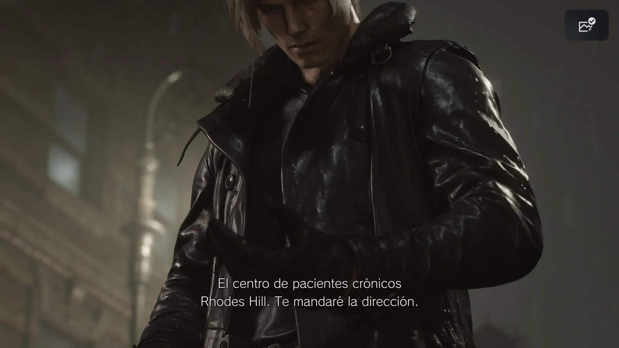 La cinemática que arranca el capítulo de Leon te pone en situación en cuestión de segundos. En Elbridge han aparecido seis supervivientes de Raccoon City muertos por la misma causa. Leon lo sabe, lo está investigando, y ya tiene un nombre en el punto de mira: Victor, alguien que compró un edificio tras la desaparición de Umbrella y que tiene conexión directa con la corporación. En el móvil, una foto en blanco y negro de una figura encapuchada con las gafas mecánicas que ya conoces. El mismo tipo. "Alguien vinculado con Umbrella."