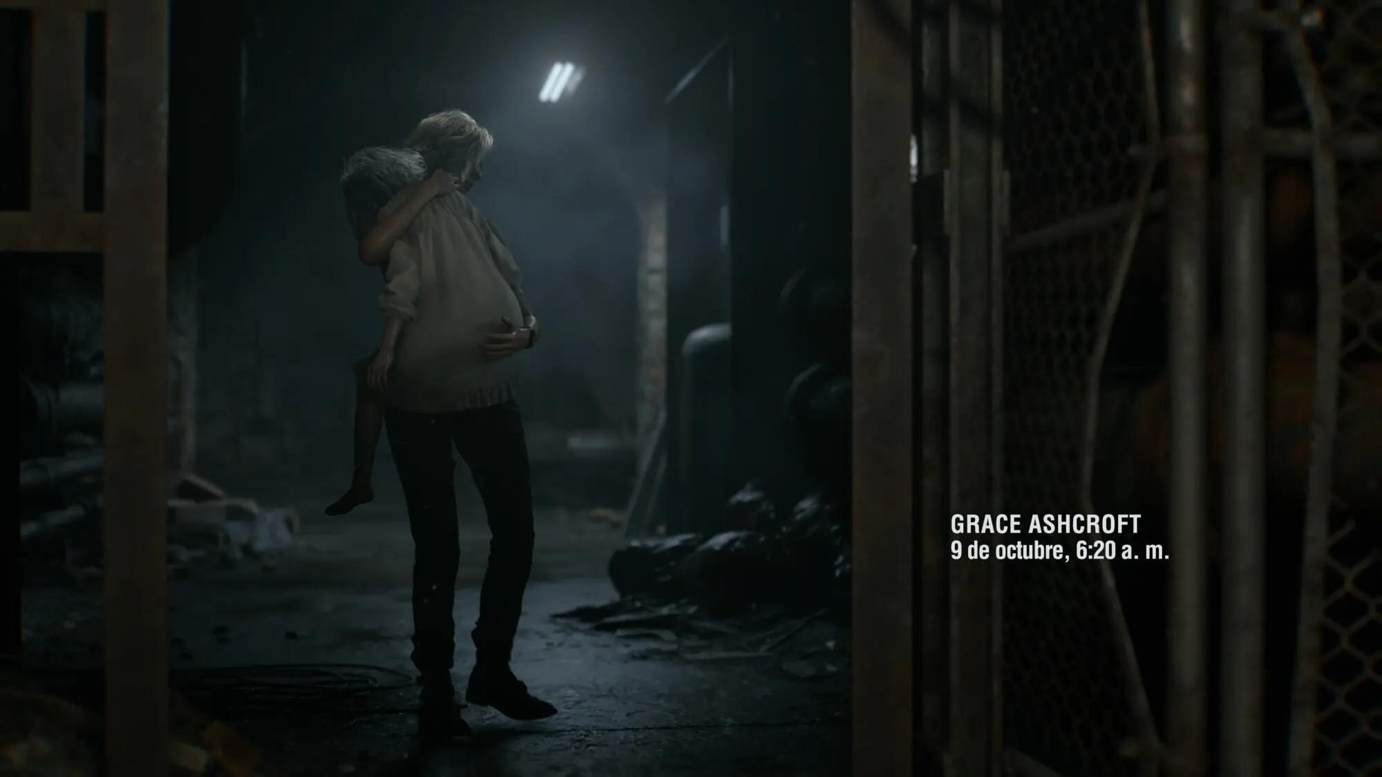 Tras el combate de jefe de Leon en la capilla, la perspectiva cambia de golpe. GRACE ASHCROFT. 9 de octubre, 6:20 a.m. Grace aparece cargando a Emily en brazos por un pasillo industrial oscuro. La razón es clara: durante la huida de la capilla, ambas han caído al vacío. Emily está herida. Grace avanza con ella a cuestas por un nivel subterráneo que no ha explorado antes, con una luz fluorescente parpadeando al fondo y rejas metálicas a los lados. No hay combate aquí, solo la urgencia de encontrar un lugar seguro.