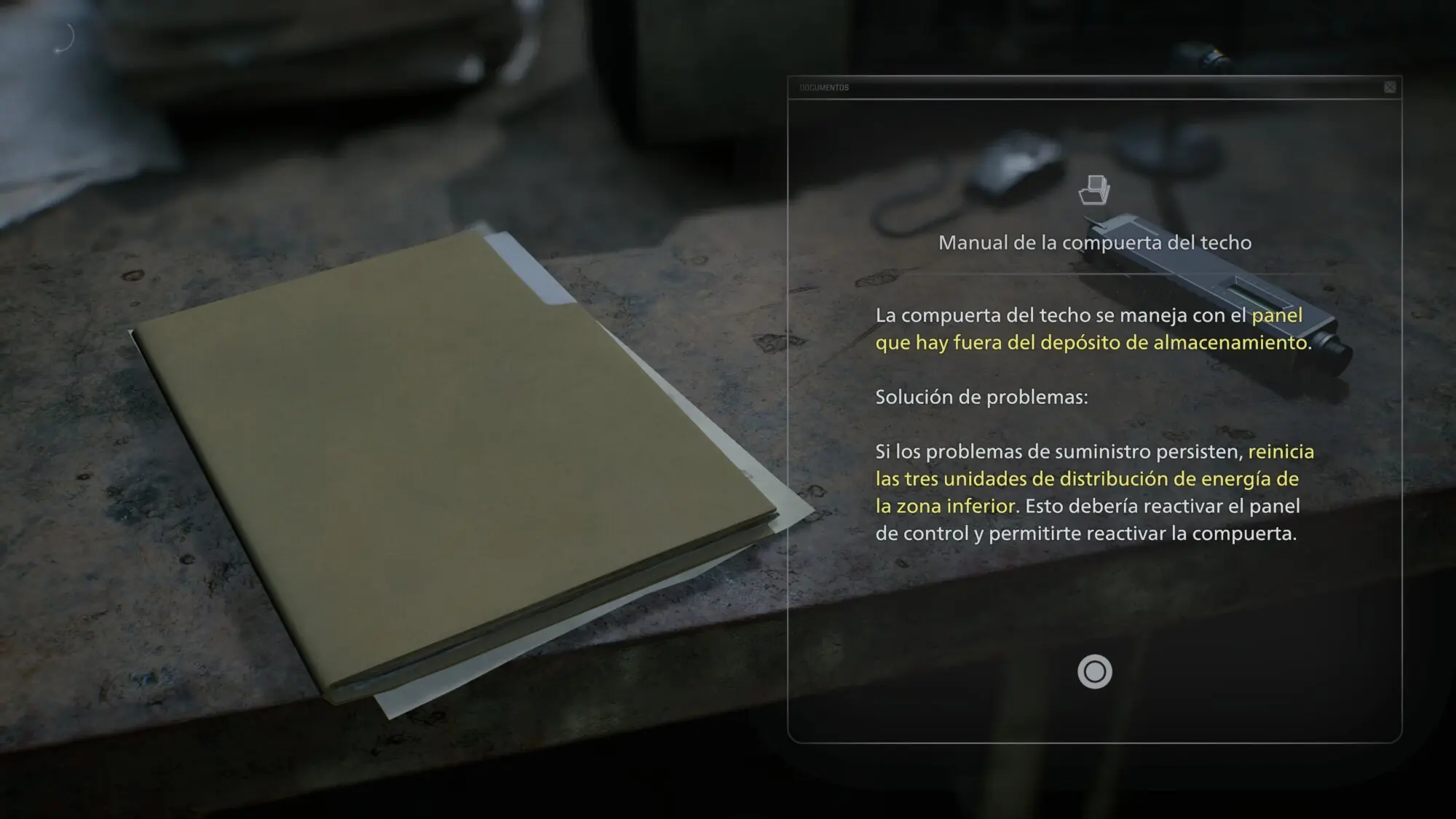 Sobre una mesa metálica con una carpeta amarilla Grace encuentra el "Manual de la compuerta del techo". Es corto pero crucial. La compuerta se maneja con el panel que hay fuera del depósito de almacenamiento (texto resaltado en amarillo). Y si hay problemas de suministro: reinicia las tres unidades de distribución de energía de la zona inferior (también resaltado). El patrón se repite: tres elementos que activar para desbloquear la salida, igual que los enchufes de junta del sótano.