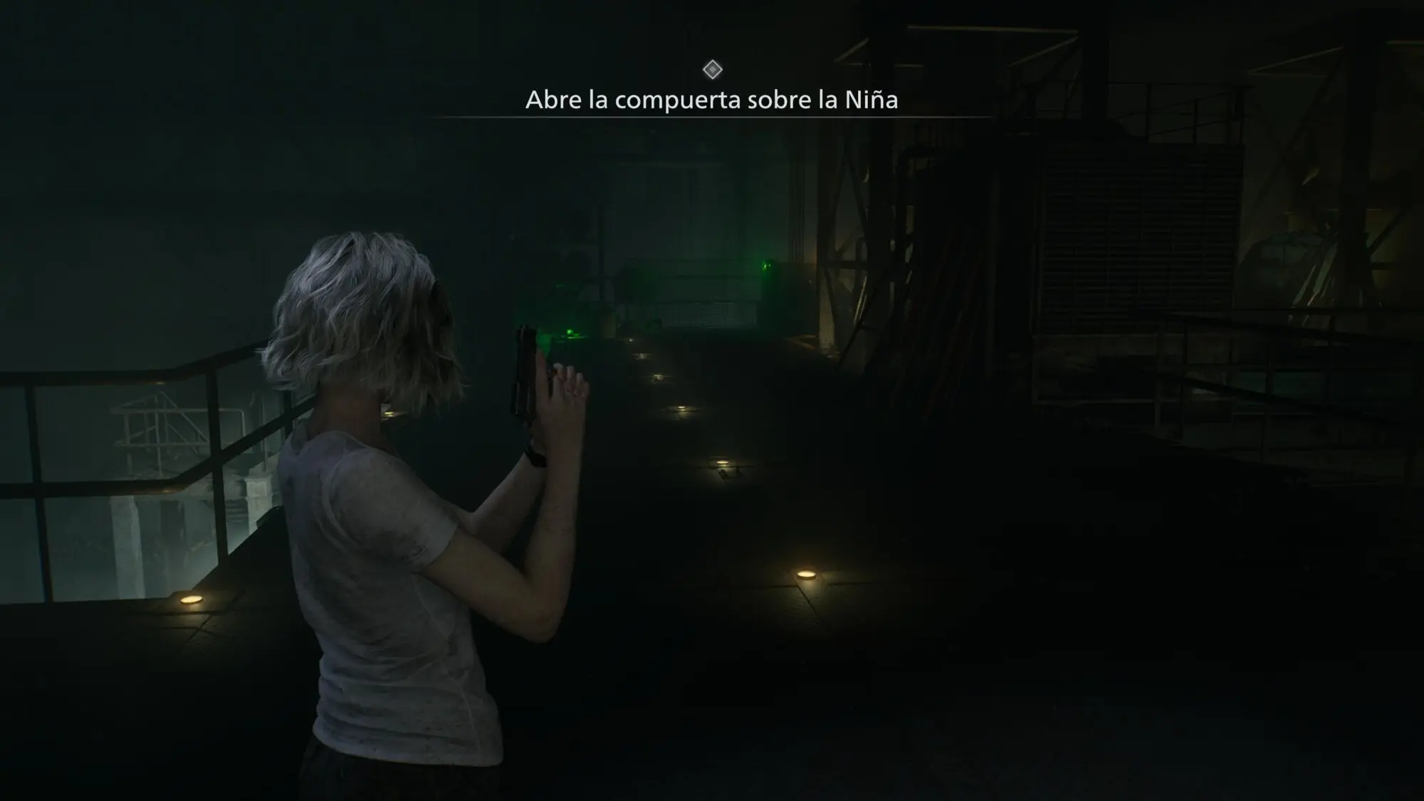 Tras encontrar el panel de control, el objetivo cambia: Abre la compuerta sobre la Niña. Grace está en una pasarela elevada con pistola en mano, mirando hacia una zona oscura iluminada por luces verdes en el suelo. La Niña —la misma criatura que mencionaban los documentos del sótano, la que tiene intolerancia a la luz UV— está ahí abajo. El plan es abrir la compuerta del techo para dejar entrar la luz del exterior y eliminarla.