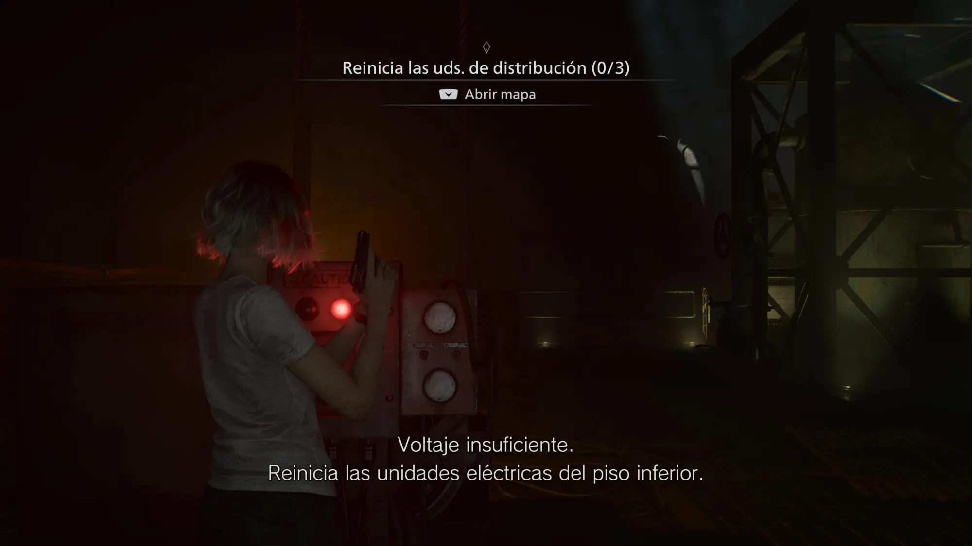 Al interactuar con el panel el mensaje es claro: "Voltaje insuficiente. Reinicia las unidades eléctricas del piso inferior." El contador aparece: Reinicia las uds. de distribución (0/3). Grace tiene que bajar y reiniciar tres unidades, pero esta vez hay una diferencia enorme respecto a la sección de los enchufes: la Niña te persigue activamente mientras lo haces. Es una sección de ritmo frenético donde no puedes detenerte. Los focos repartidos por la zona son tu mejor aliado: la Niña no se acerca a las zonas iluminadas, así que tienes que planificar el recorrido saltando de foco en foco mientras activas las unidades. Si tienes balas de la Requiem puedes dispararle para frenarla temporalmente, pero al rato volverá a seguirte. No la vas a matar con balas. La única solución es activar los tres interruptores y abrir la compuerta.