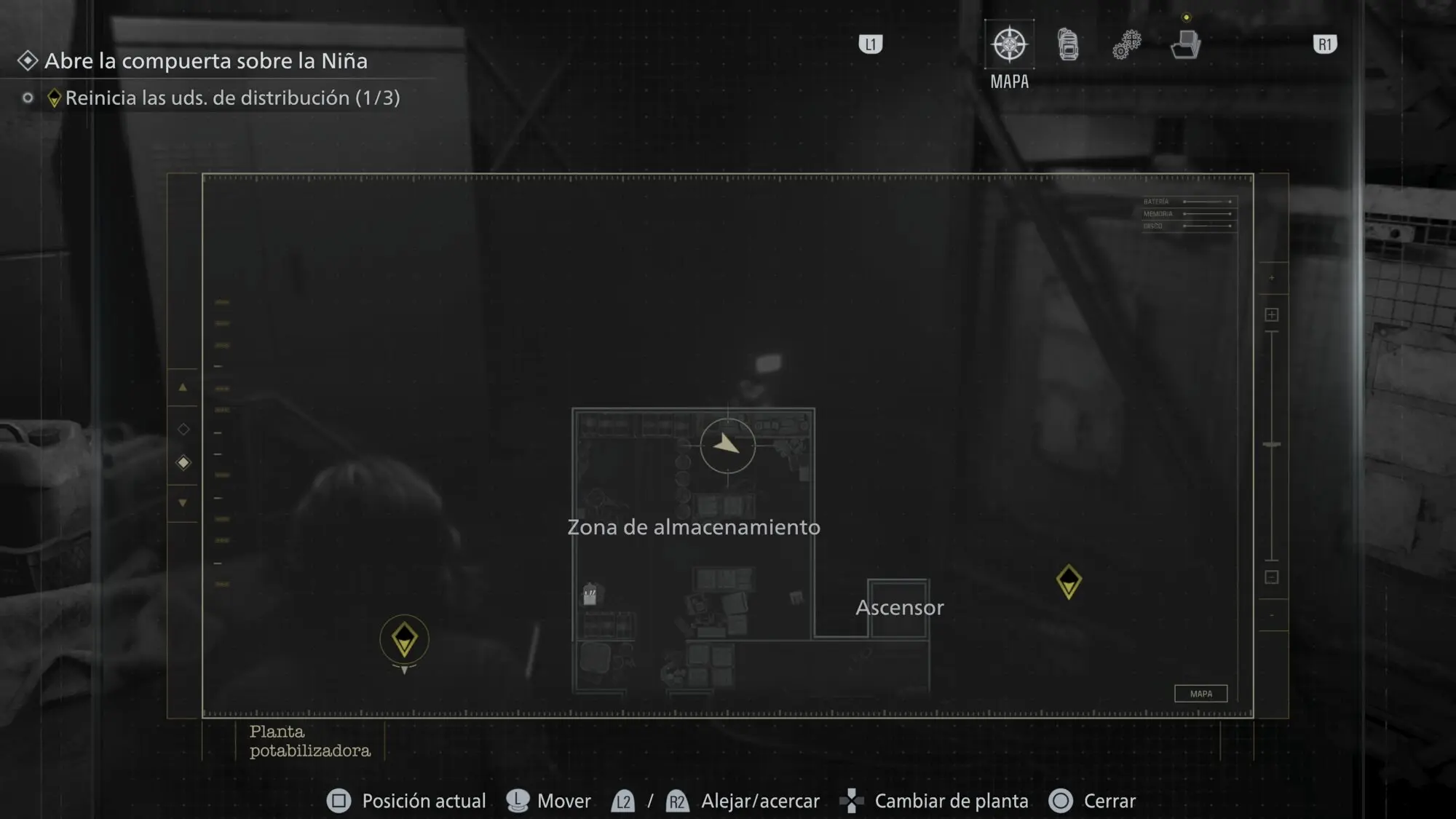 | Unidad de distribución 1/3 | Zona de almacenamiento, piso inferior | La Niña empieza a perseguirte aquí. Mantente cerca de los focos |