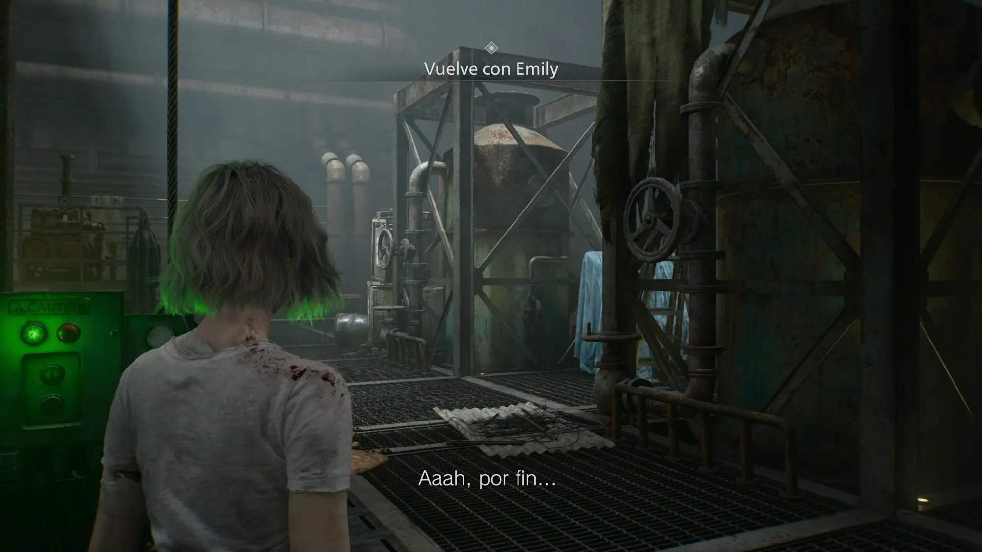 Con las tres unidades reiniciadas el objetivo cambia: Vuelve con Emily. Grace está en una zona industrial con tuberías oxidadas y niebla verdosa. "Aaah, por fin..." El voltaje es suficiente. Toca subir, activar el panel y abrir la compuerta para dejar entrar la luz solar que destruirá a la Niña.