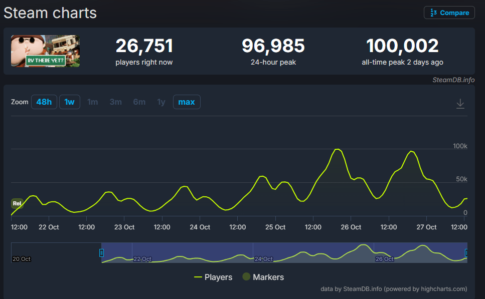 Evidentemente, hablamos de un juego que no tiene todavía los números que alcanzó Lethal Company en su momento (por poner un ejemplo), pero lo cierto es que las primeras cifras son un reflejo de que RV There Yet? Podría ser uno de los próximos bombazos del género. Algo que se refleja en que ha alcanzado los 100.000 jugadores simultáneos en menos de una semana.