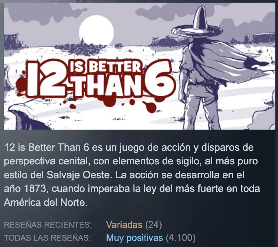 La descripción del juego en Steam dice así: "12 is Better Than 6 es un juego de acción y disparos de perspectiva cenital, con elementos de sigilo, al más puro estilo del Salvaje Oeste. La acción se desarrolla en el año 1873, cuando imperaba la ley del más fuerte en toda América del Norte".