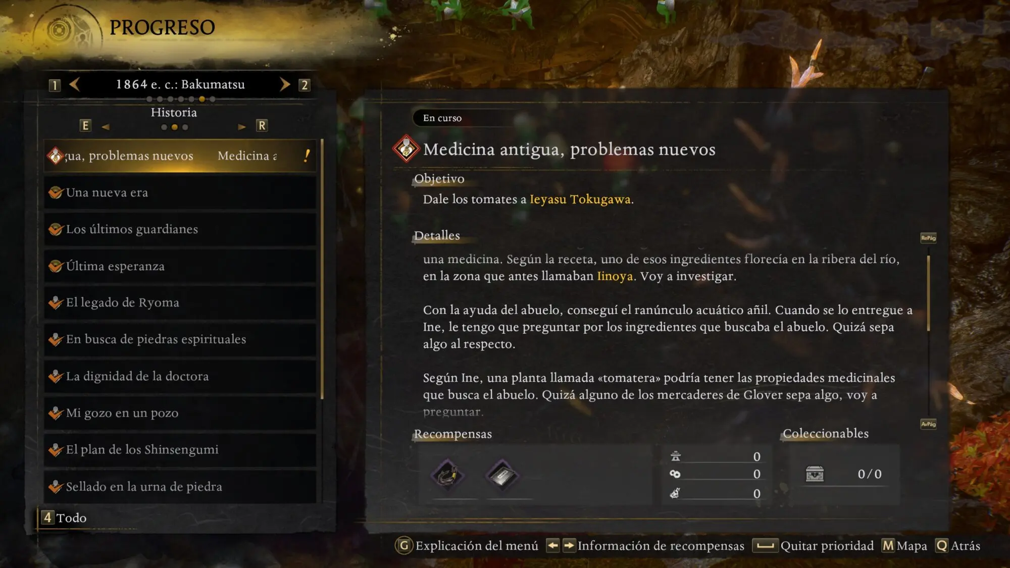 1864 e.c.: Bakumatsu Misiones Principales 📜 Misión ✅ Medicina antigua, problemas nuevos ✅ Una nueva era ✅ Los últimos guardianes ✅ Última esperanza ✅ El legado de Ryoma ✅ El dulce sonido de las cuerdas ✅