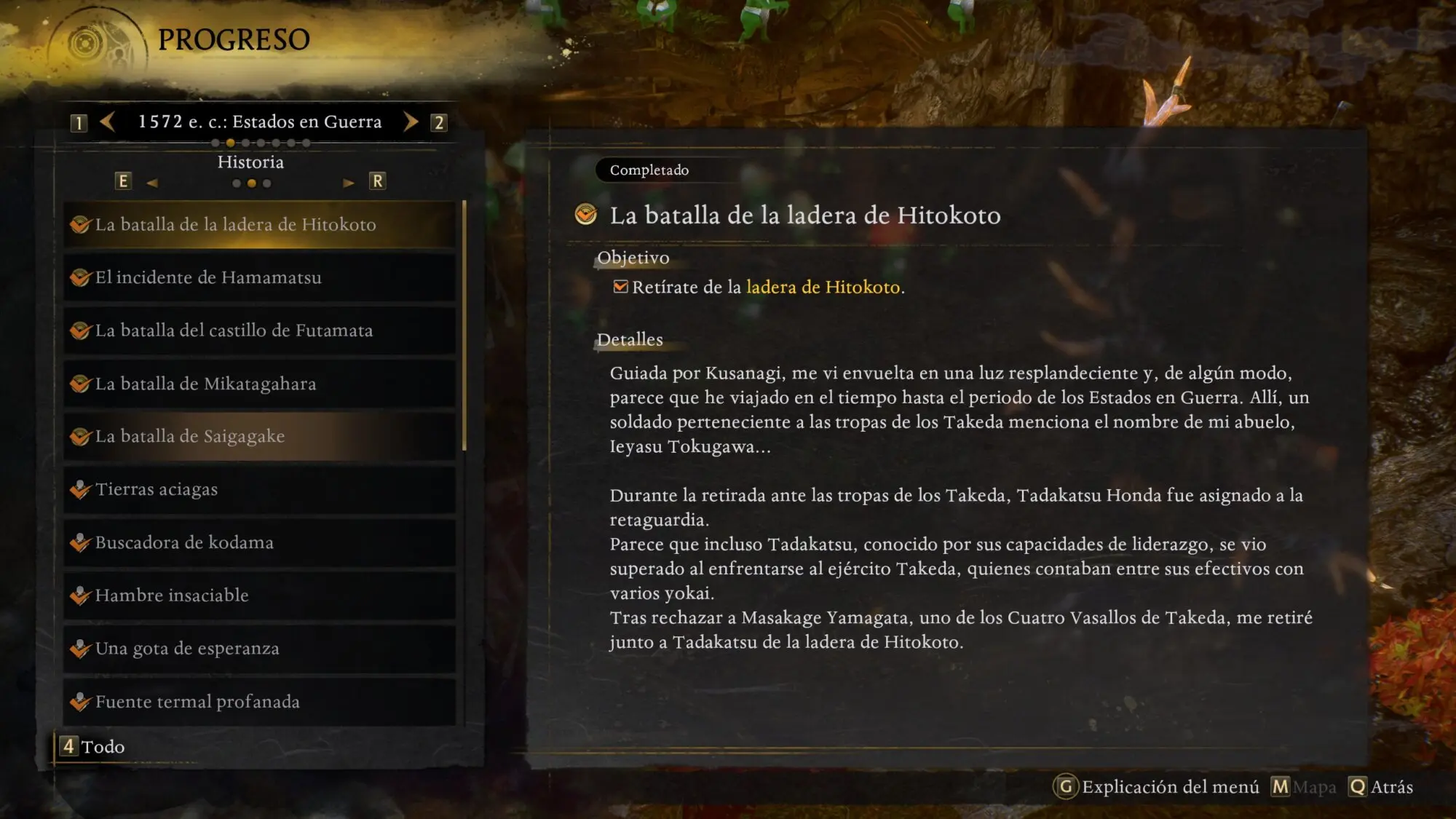 1572 e.c.: Estados en Guerra Misiones Principales 📜 Misión ✅ La batalla de la ladera de Hitokoto ✅ La huida de la ladera de Hitokoto ✅ El incidente de Hamamatsu ✅ La batalla del castillo de Futamata ✅ La batalla de Mikatagahara ✅ La batalla de Saigagake ✅ El Purgatorio manifestado ✅ Tierras aciagas ✅ Fuente termal profanada ✅
