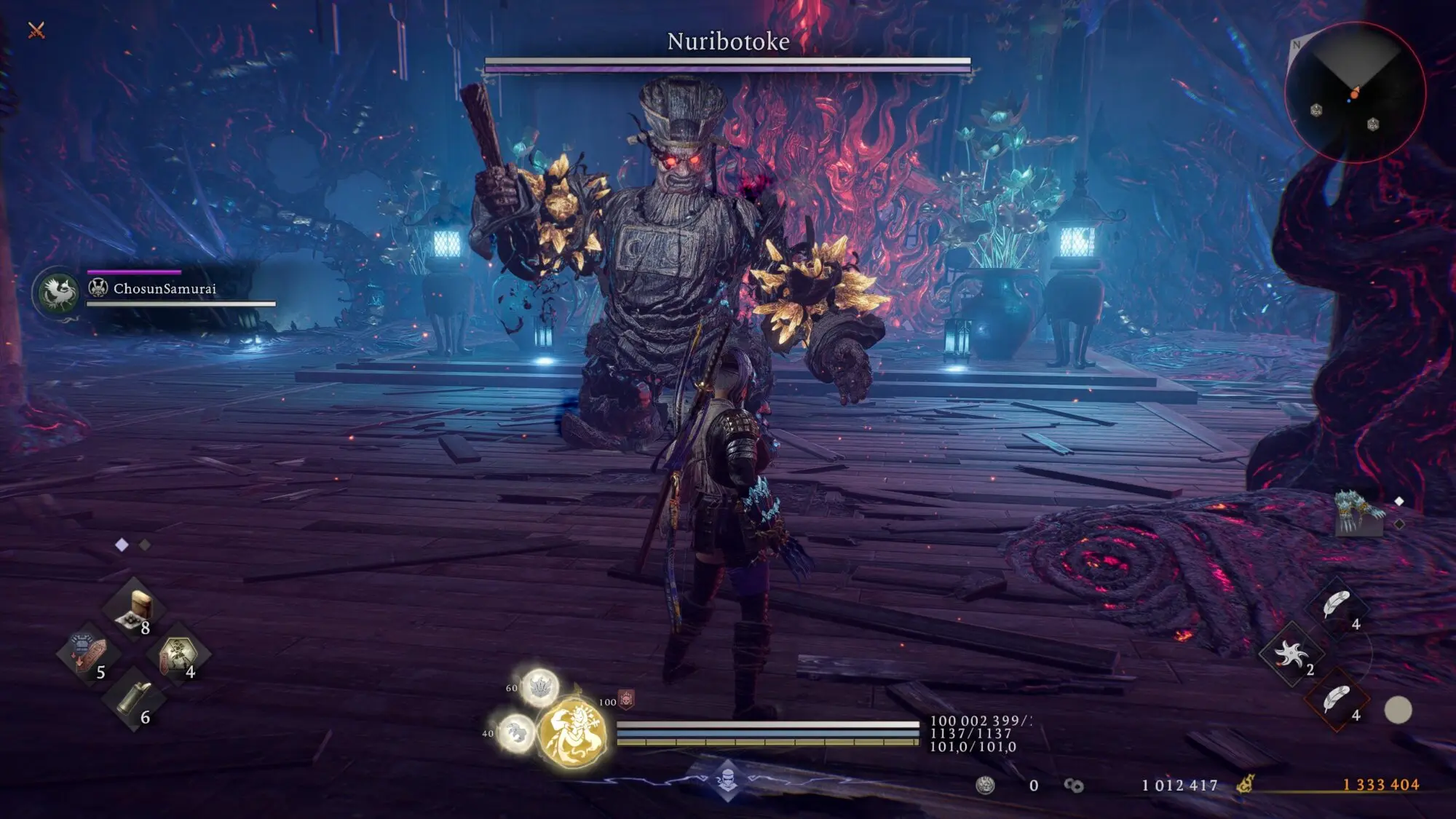Nuribotoke es un yokai monstruoso gigante con un defecto crítico: es increíblemente lento. Si mantienes distancia apropiada, tiene opciones muy limitadas para tocarte. Tu arsenal actual lo convierte en otra demostración de poder.