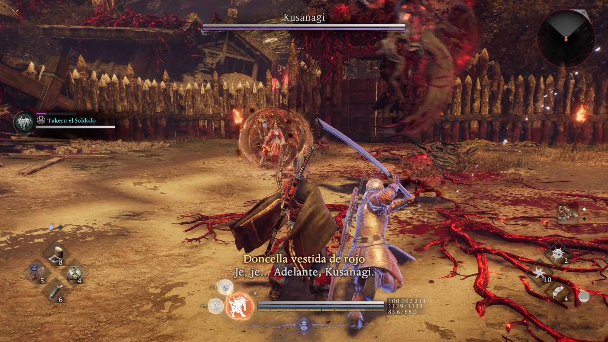 Kusanagi es técnicamente un jefe doble, pero en realidad solo necesitas derrotar al monstruo gigante principal. La hechicera acompañante tiene vida mínima, se revive automáticamente si la derrotas, y se protege con burbuja molesta. Ignórala completamente — cuando Kusanagi caiga, ella también será derrotada.