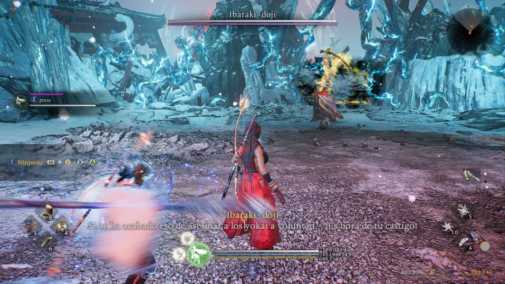 | ⚔️ Estrategia de Combate | 1. Atácalo desde atrás tras Ibaraki Doji 2. Lanza Shuriken entre cada combo (recarga Ki) 3. Repite hasta llenar Ninjutsu 4. Retrocede y bombardea |