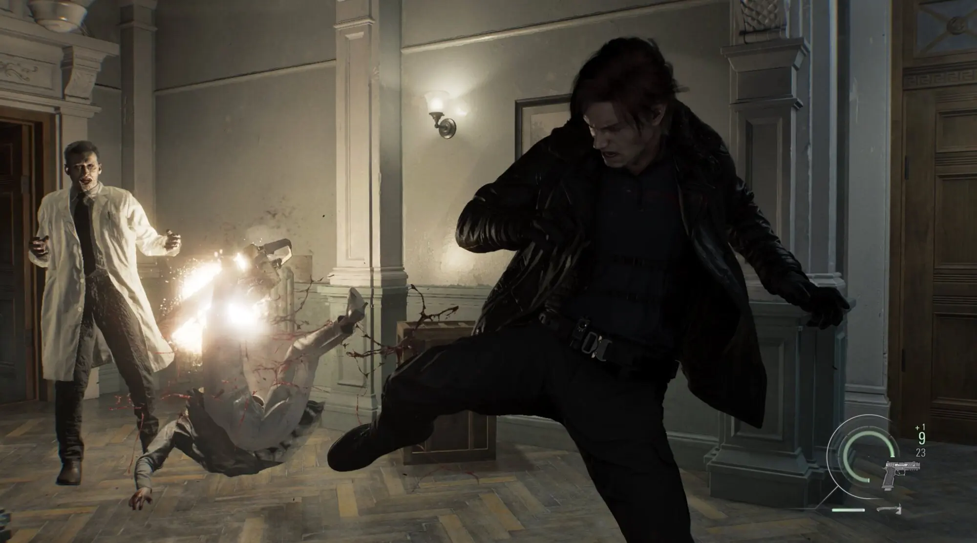 Con Leon, Resident Evil Requiem se convierte en un espectáculo digno de una película de acción. Todo es más frenético, la necesidad de pensar en la munición pasa a un segundo plano y todo se basa en la habilidad más pura a los mandos: al igual que en Resident Evil 4 Remake, Leon porta un arma cuerpo a cuerpo (un hachuela en esta ocasión) con la que podemos desviar los ataques de los enemigos y atacar, convirtiendo los enfrentamientos en un desfile de balas, contraataques, golpes con el hacha, patadas y granadas por doquier.