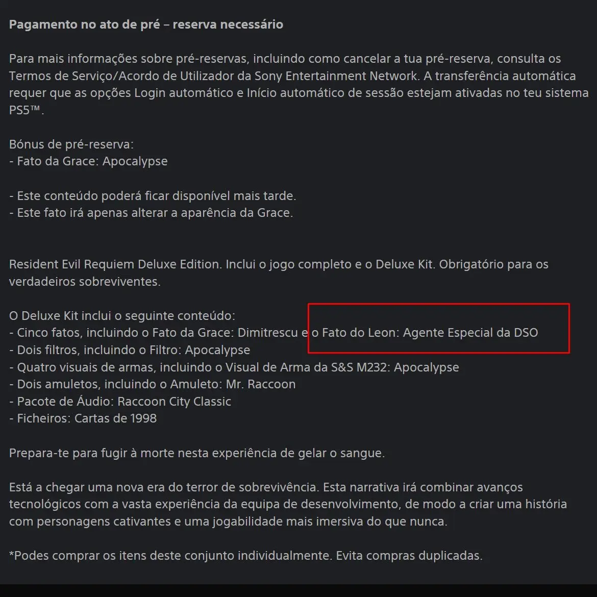 Como te comentaba, esto pasó esta misma pasada noche, momento donde se empezó a revelar un montón de contenido interesante sobre el juego y como no, sus ediciones. Pues bien, en Reddit rápidamente llegó una imagen donde PlayStation Portugal aparentemente confirma la aparición de Leon en este videojuego. Esto lo comentó debido a que estaban mostrando el contenido que llegará con la edición Deluxe del título, algo que en otras PS Stores, no han mencionado. Dice así: "El traje de Leon: Agente Especial de la DSO".