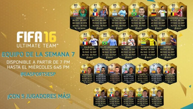 Como cada miércoles, EA Sports nos trae un nuevo equipo de la semana para FIFA 16 Ultimate Team. Podemos encontrar grandes jugadores esta semana como Hulk, Keylor Navas, Aubameyang y por supuesto Luis Suárez. El astro uruguayo logró un hat-trick la semana pasada ante el Eibar, liderando a todo un Barcelona ante la ausencia de Messi.